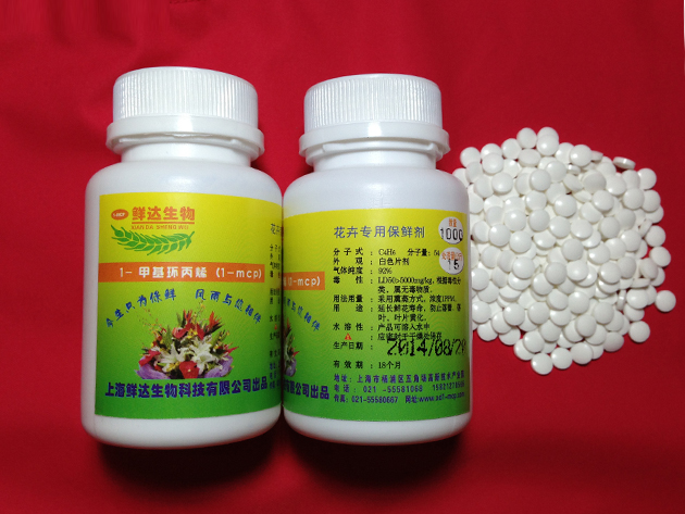 “+倍鮮”牌“花卉保鮮劑(片劑)” 其有效成分為1-甲基環丙烯(1-MCP),主要針對鮮切花以及鮮花店內的鮮花進行保鮮。用“花卉保鮮劑”保鮮鮮花,可以抑制乙烯對鮮切花的促衰作用,有效抑制鮮切花成熟前的萎蔫和開放,減少花的褐化和葉片黃化,防止落花落葉。尤其在鮮切花運銷環境中含有微量乙烯時可減緩鮮切花的老化反應,降低鮮切花在貯運中的呼吸強度,延長鮮切花的壽命。多項試驗表明:“花卉保鮮劑”(1-MCP)對康乃馨保鮮處理后,花期較不處理的延長2倍以上, 效果明顯,處理過的康乃馨顏色較不處理更為鮮艷,“1-MCP” 保鮮劑處理的效果超過傳統的“STS”。